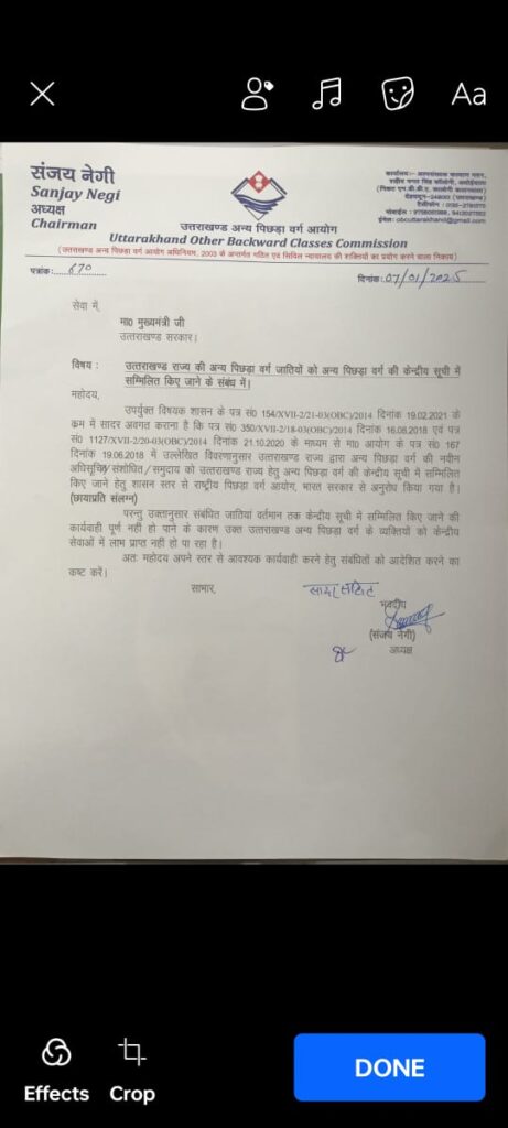 भेंट के दौरान उत्तराखंड अन्य पिछड़ा वर्ग आयोग की ओर से एक अनुरोध/प्रस्ताव माननीय मुख्यमंत्री जी को सौंपा गया, जिसमें उत्तराखंड की विभिन्न जातियों एवं समुदायों को केंद्रीय पिछड़ा वर्ग (OBC) की सूची में सम्मिलित किए जाने की मांग की गई। आयोग ने यह भी अनुरोध किया कि राज्य सरकार की संस्तुति के साथ यह प्रस्ताव भारत सरकार को प्रेषित किया जाए, ताकि संबंधित जातियों को केंद्रीय सूची में शामिल किया जा सके।